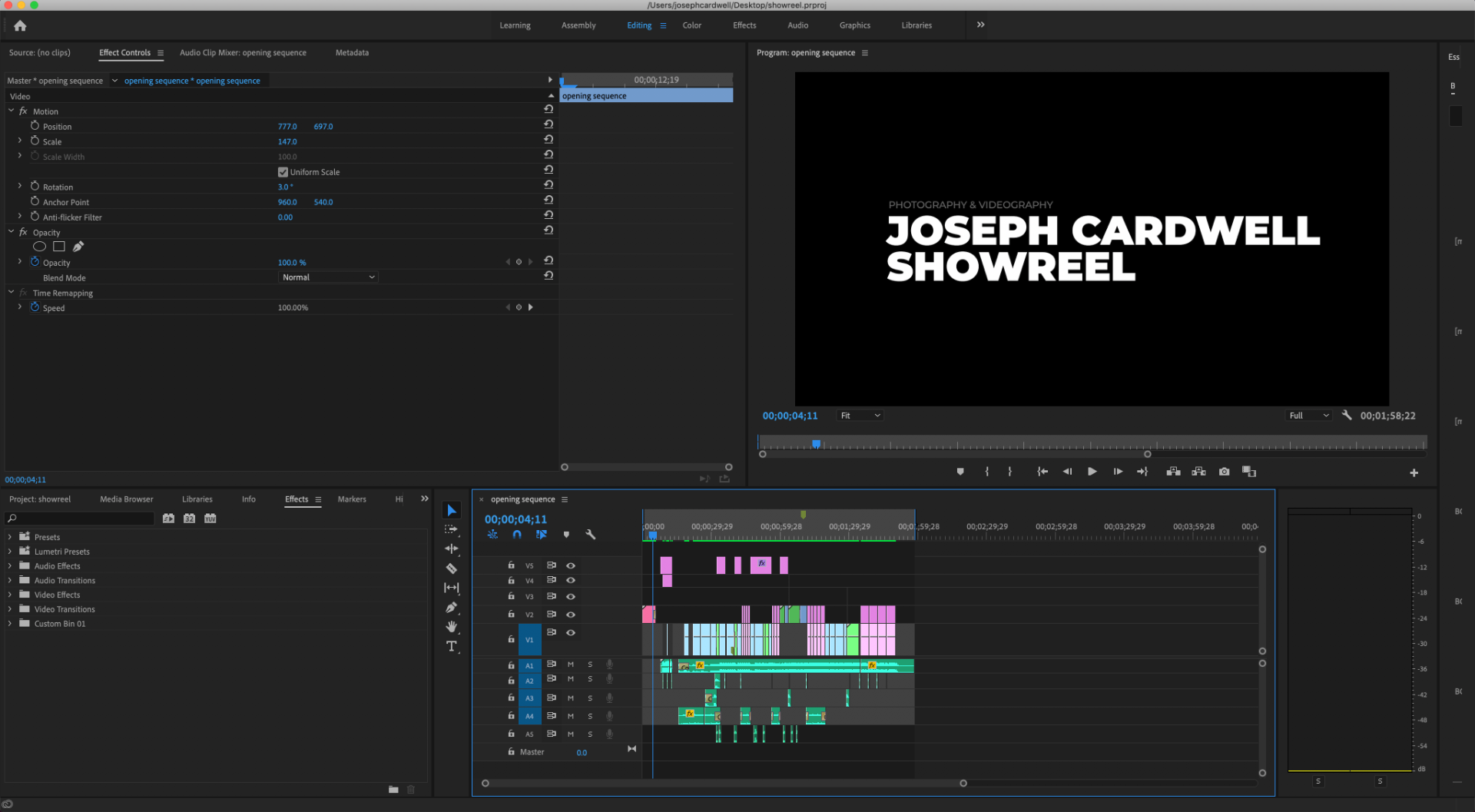 This is an overview of the editing process of my showreel. The software I am using is Adobe Premiere Pro as it is great for adding effects, assembly and rendering videos. I am also using Premiere Pro because it is the editing software that I find the easiest to use and I have a good understanding of the software.