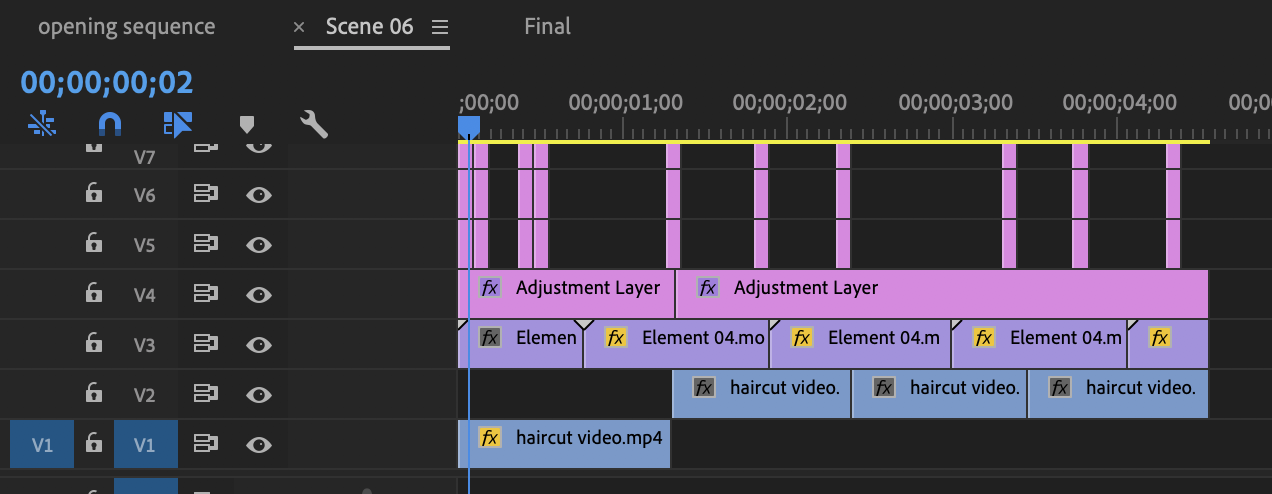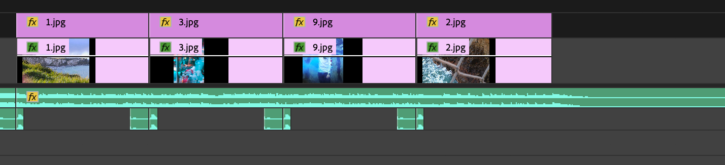 I created a second project named scenes. This is where I created the small glitch/line effects seen throughout the showreel. The image on the right shows how I created one of the sequences. I decided to add these glitch effects into my showreel because they are quite subtle and do not take away from the content being shown. It also shows off my editing skills to the audience and helps to make the static photos more interesting to look at.
